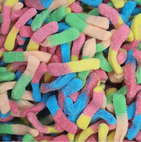 Sugar coated fruit flavour jelly sweets in the shape of worms in very eye catching, bright, neon colours