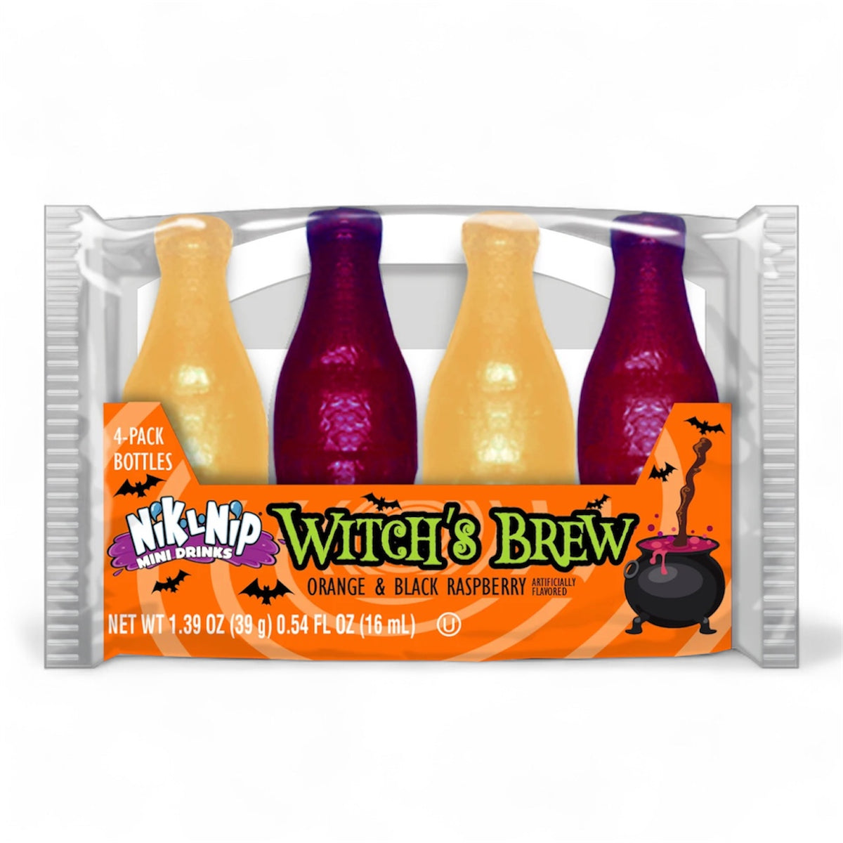 Pour on the feelings of nostalgia this Fall with Nik-L-Nip Witch's Brew Bottles. The wax bottle candy everyone loves gets some seasonal flare with spooky orange and black raspberry flavors. Add in seasonal packaging featuring a caldron and broom and the 4 pack of Nik-L-Nip Witch's Brew will be a favorite trick-or-treat candy and Halloween party favor.