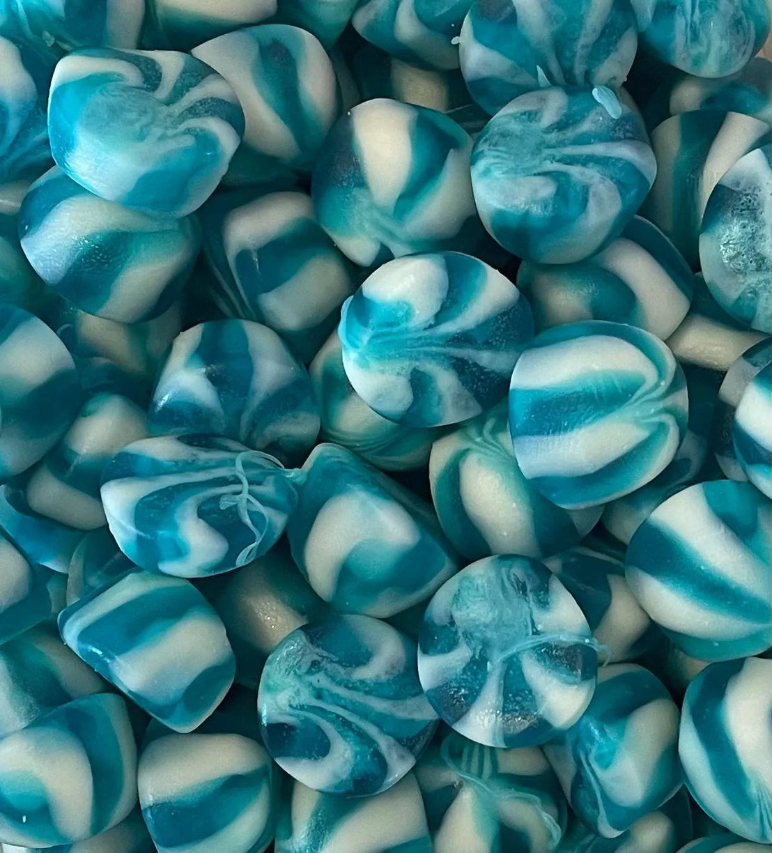 A little jelly made in blue and white stripes, kind of like a confectionery butcher's apron, these twists are blue raspberry flavour and are, frankly, delicious
