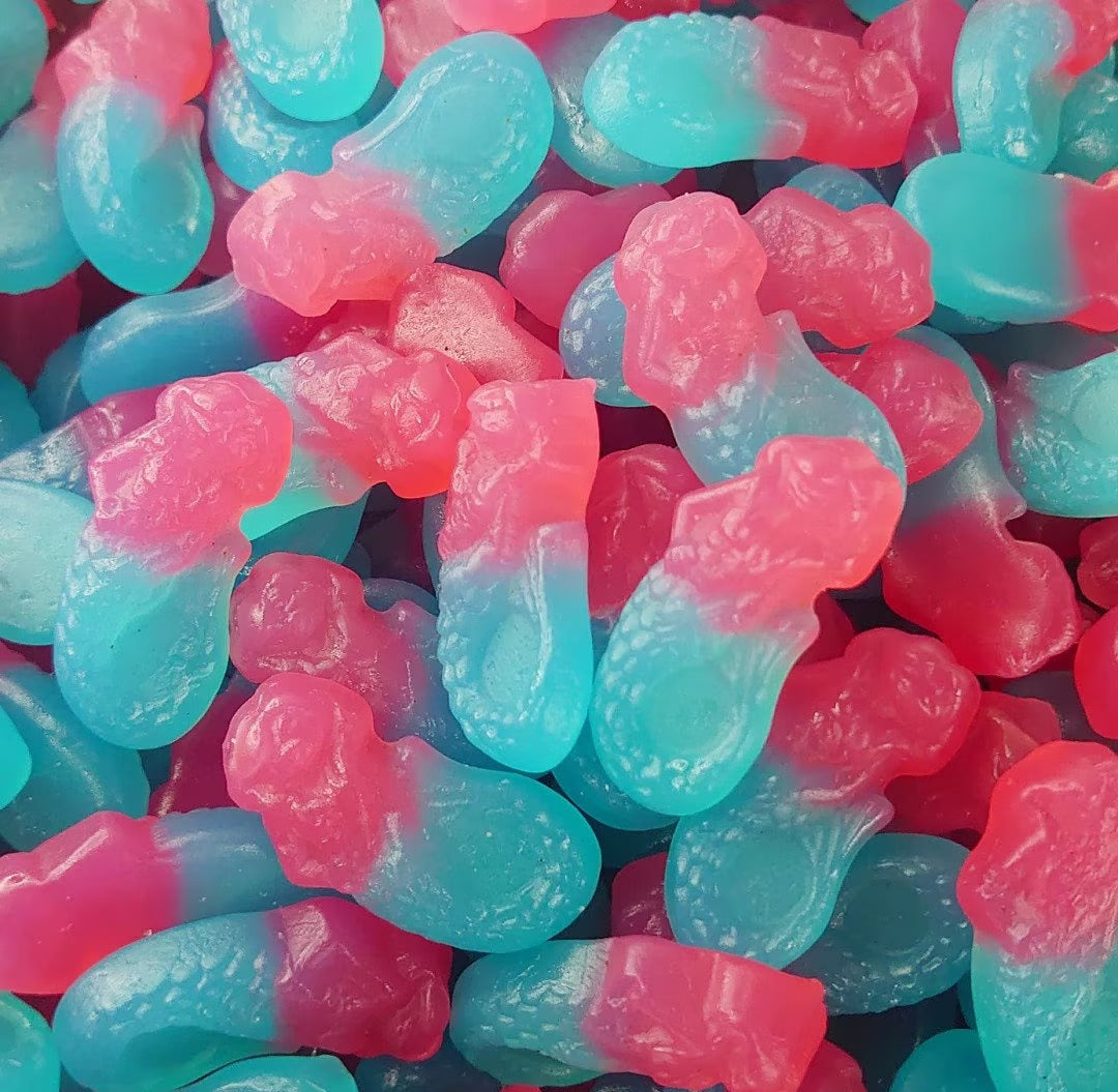 Sugar, glucose syrup, wheat starch, water, modified maize starch, modified potato starch, acids (lactic acid, malic acid, citric acid), fruit and vegetable concentrate (black carrot;) colours (titanium dioxide, brilliant blue FCF), flavouring, vegetable oil (coconut), glazing agent (carnauba wax)