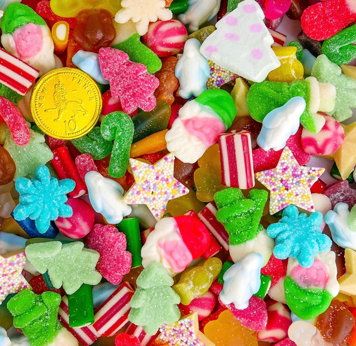 The mix contains 10-12 different sweets from Santa coins, Xmas chocolate balls, Xmas trees, elves, fizzy canes, reindeers, santas, penguins, tree mallows, snowflakes and more..