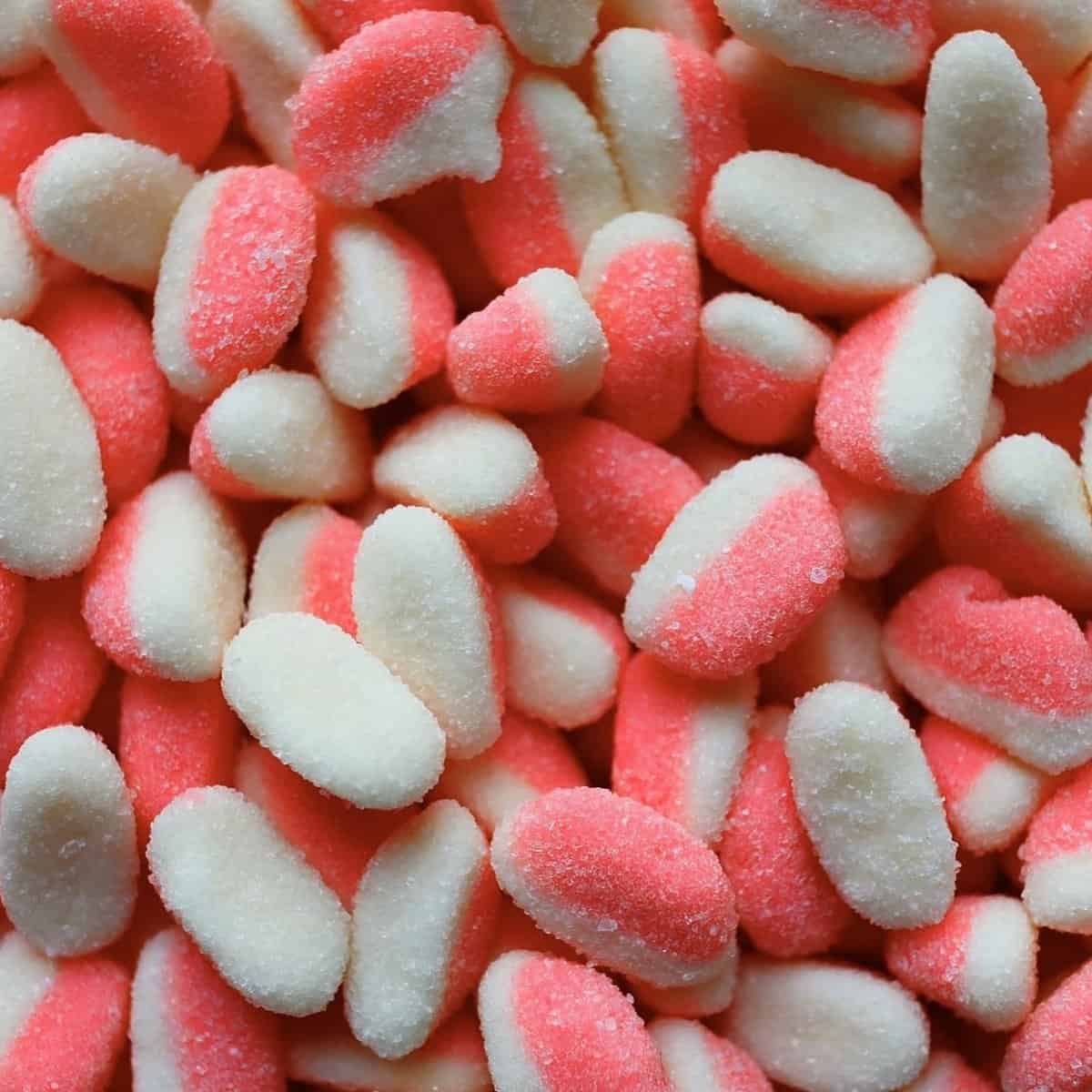 Sweetzone Strawberry Puffs are tasty, sugar coated little strawberry shaped sweets with a pink strawberry flavoured top and a white vanilla flavoured bottom. All Sweetzone products are 100% halal.