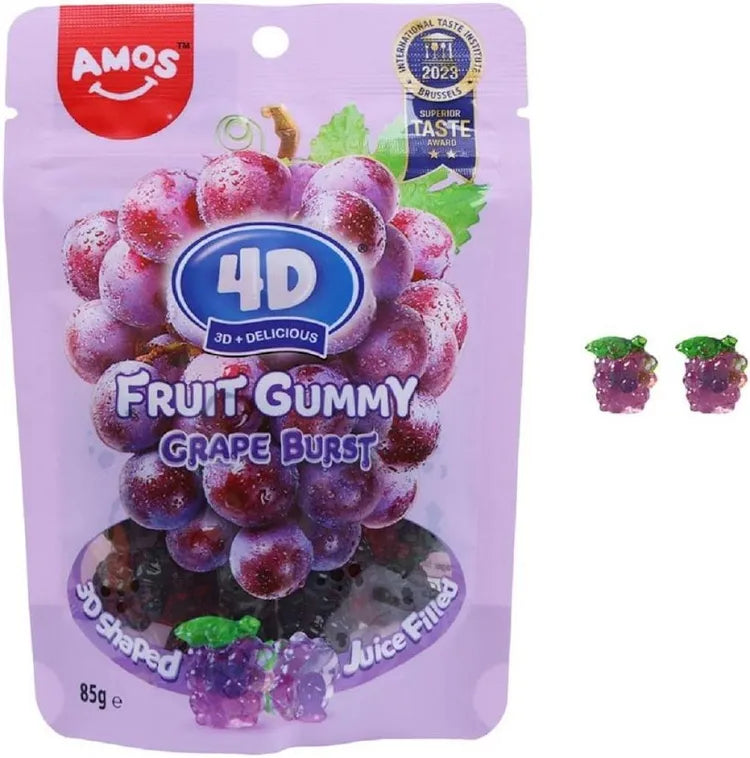 Amos 4D Fruit Gummy Grape Burst sounds like a tasty and fun treat! These gummies typically have a soft, chewy texture and a burst of peach flavor that makes them really enjoyable. The "4D" aspect often refers to an enhanced sensory experience, like different textures or flavors in each bite. Perfect for snacking or sharing, they’re great for anyone who loves fruity candies! Have you tried them yet?